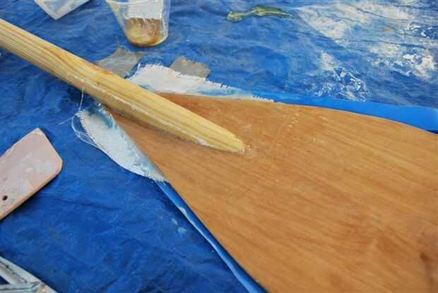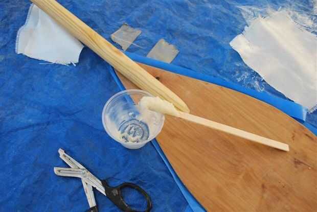 Mezclar el epoxi y en un recipiente aparte, mezclar algún material de relleno. La mezcla debe parecerse a puré desagradable. Difundir un montón de esto en la parte plana de la manija y en su lugar. Presione hacia abajo hasta el exceso gira hacia fuera, entonces utiliza el palito para hacer un buen filete. Poner el paño y mójelo con un cepillo de viruta de 2". Cuidadosamente use la escobilla de goma bondo para adherir la tela y a tuck alrededor de la articulación. Debe haber sin entrehierros y no exceso epoxy, ya que esto hará que un punto débil.