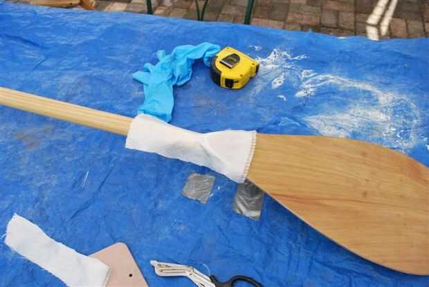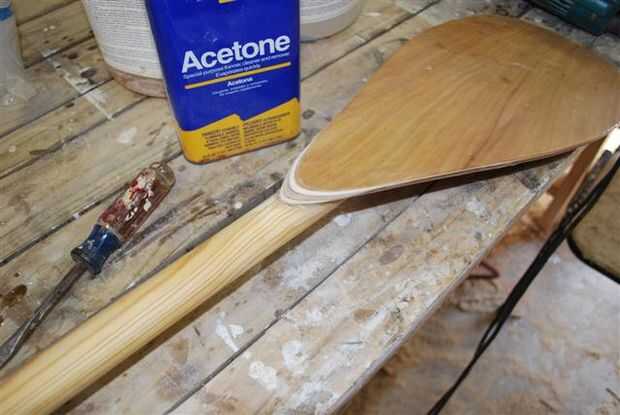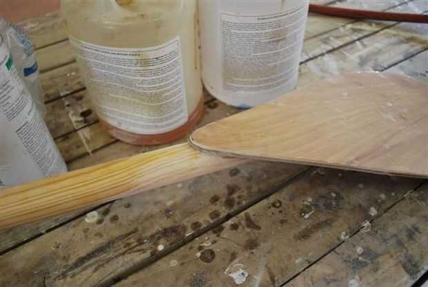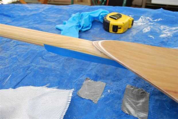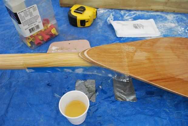 Hay una chepa donde el borde de la madera contrachapada con la eje - este solo no. Pluma en la hoja e intenta hacer las capas reveladas de capas simétricas. Tenga cuidado de hacer un borde de la maquinilla de afeitar-agudo en el borde superior de la hoja! Al igual que el último paso, añadir un pequeño trozo de paño para cubrir toda la madera cruda, con aproximadamente 2" de superposición en la hoja y que se extiende sobre 4" - 5" hasta el eje. Añadir algunas faldas de la pequeña cinta de enmascarar en el eje para que el epoxi no se ejecuta por debajo. Aplicar el epoxi con un chip cepillo y secador, tenga mucho cuidado para asegurarse de que la tela se adhiere alrededor de la articulación. Cuando el paño es coriáceo, recortar con una cuchilla de afeitar luego a pie durante 24 horas.