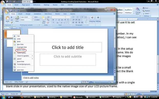 En este punto, la presentación debe tener dos diapositivas: la diapositiva de título predeterminado inicial y la diapositiva en blanco recién insertada. Haga clic en la primera diapositiva (diapositiva de título), haga clic en el botón derecho del ratón y seleccione eliminar. Usted debe dejar con una sola diapositiva en blanco en su presentación, tamaño para el tamaño de la imagen nativa de tu marco de fotos LCD.