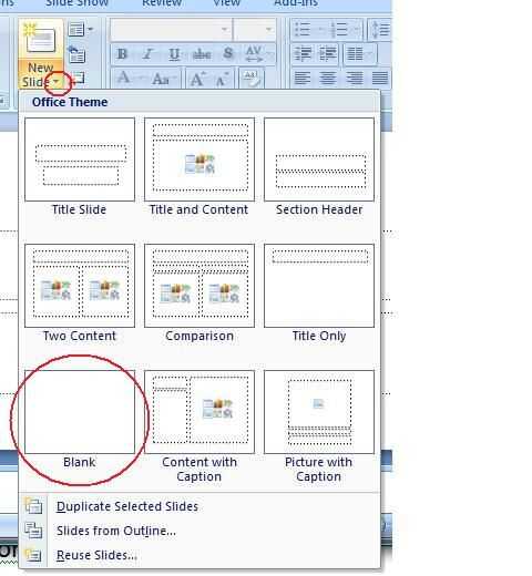 Ahora, busque el botón Nueva diapositiva. En la esquina inferior derecha del botón, debería haber una pequeña flecha. Haga clic en la flecha, que debe traer para arriba un montón de opciones de diseños de diapositivas. Seleccione la diapositiva en blanco.