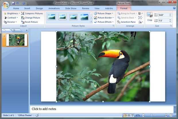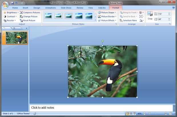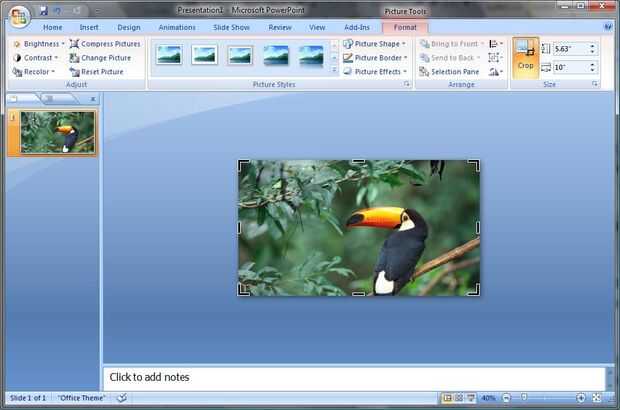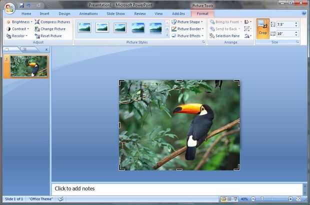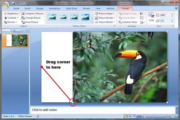 Una palabra acerca de recortar las imágenes: cuando usted recortar imágenes, usted puede perder partes de la imagen que lo convierten en una composición agradable. No dude en arrastrar cualquiera de las asas de cultivo y mueva la foto hasta que llegue la imagen buscando la forma que desee. Sólo asegúrese de que cuando haya terminado, que la imagen está alineada con los bordes de la diapositiva de PowerPoint.