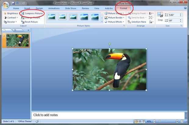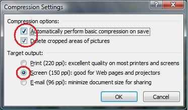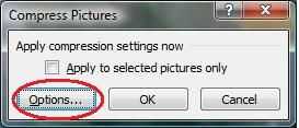 Seleccione la imagen y haga clic en el botón de formato en herramientas de imagen de la cinta. Seleccione el botón "Comprimir imágenes". En el cuadro de diálogo comprimir imágenes, seleccione "Opciones". Configurar las opciones de compresión como la imagen de abajo y haga clic en Aceptar. Sólo deberás realizar estos ajustes de la primera vez. Por último, haga clic en aceptar en el cuadro de diálogo comprimir imágenes. Esto hace que la imagen más pequeña y elimina las porciones recortadas de la imagen, dejando una imagen de diapositiva-relleno.