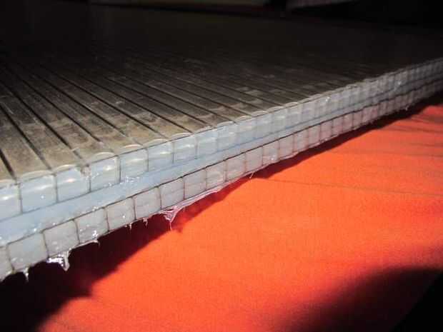 Si se mira desde el lado, el panel de policarbonato tiene su perfil como tubos pequeños, te recomiendo para sellar, si el agua consigue en, puede afectar a la transparencia. Deje la silicona para curar durante 24 horas. Después de eso, corté las esquinas de los paneles a 45 grados.
