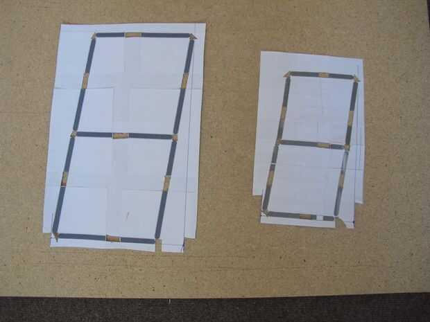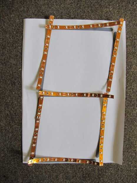 El papel usado era tamaño A4, 4 hojas poner con cinta de embalaje; éstos fueron impresos en casa con mi impresora personal. Después de eso, algunos cortes/agujeros fueron cortados en cada extremo de cada segmento sobre los patrones de papel para poder marcar los puntos donde encajar las tiras de LED - guías de montaje.