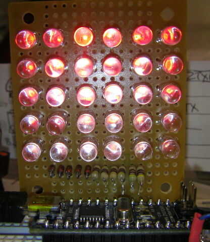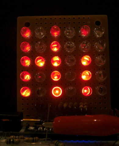 Todo lo que necesitas para la exhibición de LED es 30 LEDs de cualquier color, 6 x 390 ohm resistencias, diodos de baja potencia 5 x 1N4148 (o 1N914), algunos hilos finos y un pequeño trozo de perfboard para sostener todo. Costo total, tal vez $5,00.