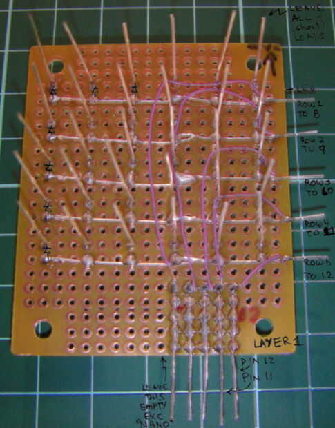 Comience con una (5cm x 7.5 cm) de 2 "x 3" pieza de perforado de circuitos (perfboard) y arreglar los LEDs como se muestra. Alinee las puntas más corto (-) hacia la parte superior de la Junta, que había marcado con una flecha.