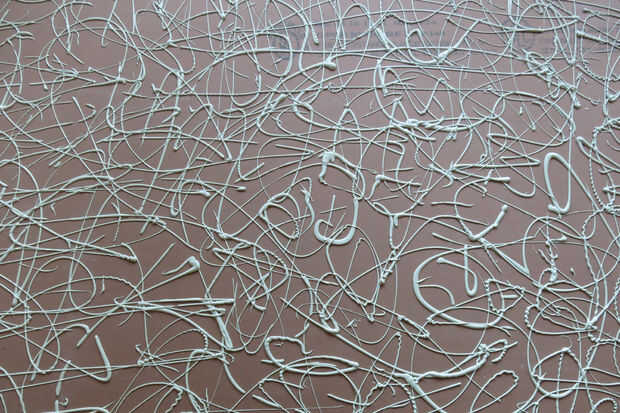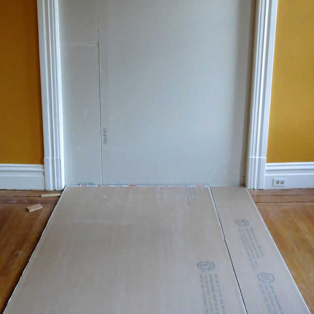 Aquí está la diversión parte! Coloque la segunda capa de yeso para la conexión fácil a la pared, y squiggle dos tubos de pegamento verde sobre ellas. Usando un patrón al azar como este es el método recomendado. Rápidamente, levante y coloque el yeso mientras que el pegamento verde está todavía húmedo, con tornillos alrededor de 16" de distancia.
