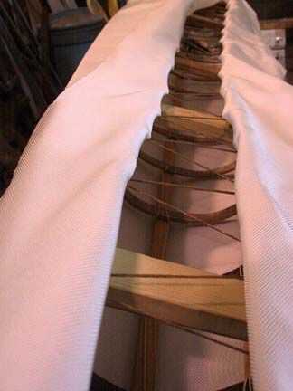 El vertical del barco del tirón para que pueda trabajar en la cubierta. Usar algunos cordeles sintéticos fuerte, encaje hacia adelante y hacia atrás a través de la plataforma para reunir a los lados de la tela. Comience cerca de la proa a un punto donde la cubierta es aproximadamente de 6 pulgadas a través y cordón hasta la cabina. Utilice una aguja de coser recta para coger aproximadamente un cuarto de pulgada de la tela para cada cordón hacia adelante y hacia atrás. La cuerda del cordón debe ser aproximadamente 18 pies de largo. Usted quiere lo suficiente como para zigzag desde la proa hasta la bañera. Cuando haya llegado a la cabina, ate el extremo de la línea o sujetarse a una viga de cubierta. A partir de la proa, apriete la línea completamente a la cabina. Usted puede ahora permanentemente atarla apagado.