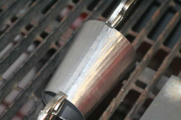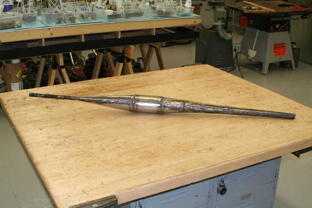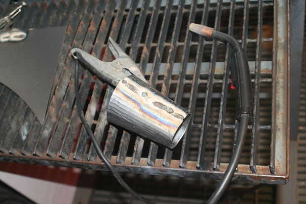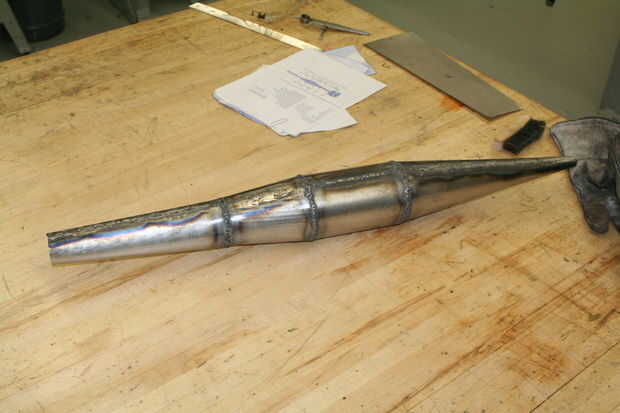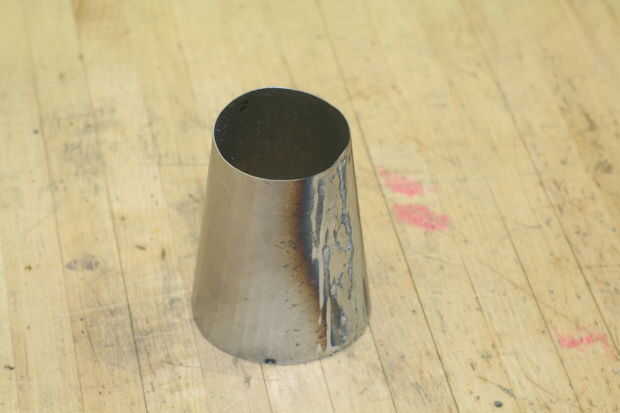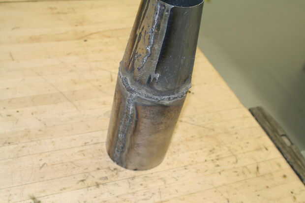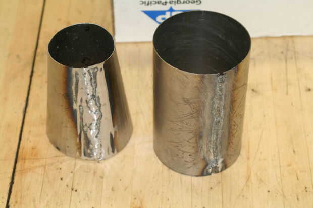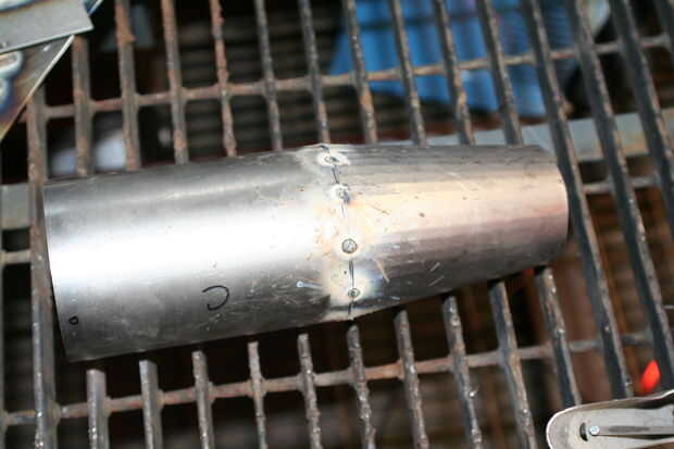 Piezas individuales: elige uno de los conos o cilindros y empezar por la Junta de soldadura como se explicó anteriormente. Empecé con el vientre de la tubería (el cilindro del centro). Soldadura de tachuela juntos, luego soldarlo para arriba. Puede hacer una sola pieza en un momento y luego soldar las piezas juntas, o puede soldar todas las piezas y luego soldar las piezas juntas.