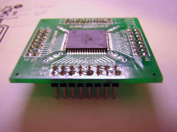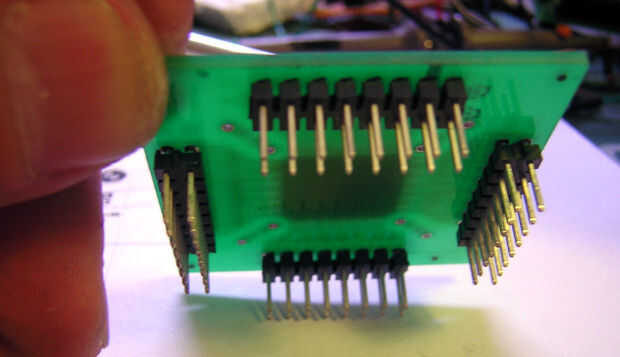 Ahora que tienes tu MCU Xmega soldado en la compañía junta, soldadura en cabeceras masculinos 2 x 8 con las conexiones señalando la parte inferior del transportador. Ver las fotos a continuación. Una vez que lo hayas hecho tu tabla portador haya terminado. Este es el componente que usted puede Agregar y quitar a su tablero de programación y el dispositivo de producción.