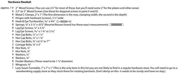 A continuación encontrarás una lista de todo el hardware necesario para el proyecto. La mayor parte de se puede encontrar en su ferretería local, aunque usted puede encontrar que no tienen a mano la cantidad total de las abrazaderas en c o resortes. Usted también tendrá que ir a una tienda de carpintería de la especialidad para encontrar el eslabón giratorio (susan perezosa). Asegúrese de obtener un trabajo pesado, 7 "x 7" x 1 "modelo o a comprometer la efectividad de su prensa.