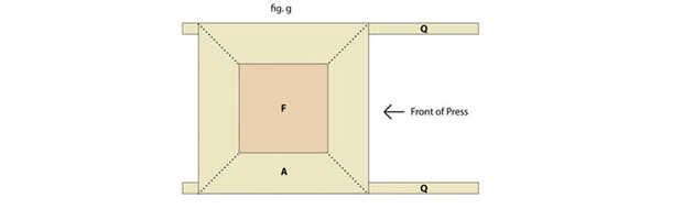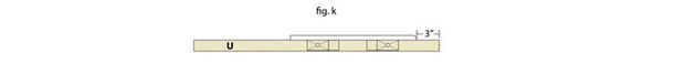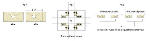 Con el taladro o tornillo de banco y taladro, crear orificios de media pulgada en el centro de la parte más grande de 4 de sus piezas. Para los 4 restantes, marcar una linea 2 3/8" en el extremo y taladrar los agujeros en el nuevo medio (ver fig. h). Luego coloque en el tablero G como se muestra en la figura i. usar un 2 x 4 para ayudar a la madera del espacio para la placa cómodamente en el brazo del rodillo cuando esté listo. También asegúrese de que la distancia entre los agujeros en una sola dirección es la misma distancia exacta que los orificios que va al revés (ver fig. j). Usted definitivamente querrá orificios antes de colocar piezas W o tendrás problemas con división de madera.