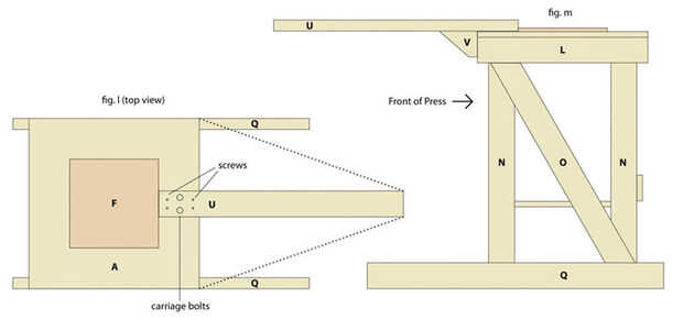 Paso 8: ahora que los agujeros son taladrados en el brazo del rodillo, vamos a fijar a la mesa. Utilizar sus dos pernos con las correspondientes arandelas y tuercas hexagonales para adjuntarlo y añadir cuatro tornillos para mayor estabilidad. Ver fig. l para la colocación. Las líneas punteadas indican cómo medir para asegurar que el brazo del rodillo es recto (antes de la fijación). Instale parte V como se muestra en la fig. m de modo que esté centrado en el medio de parte U. Asegúrese de que los tornillos van en la tabla y la base del brazo.