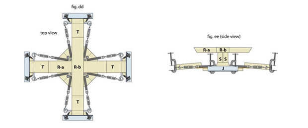 Paso 17: Parte I-a tiene una muesca en la parte superior, la parte b de R tiene una muesca en la parte inferior. Parte I-b en la parte del pegamento R-a para que las muescas se cruzan formando una X. Fije esta X encima de piezas de S para que quede centrado, como se muestra en las Figs. dd y ee.