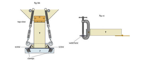 Paso 16: (Nota importante: fig. BB muestra cómo colocar abrazaderas de 2,5 en la prensa con piezas alteradas X. Puede utilizar 2 abrazaderas apenas tan con eficacia creando piezas X como se muestra en la sección de materiales (1 1/4 x 1), y luego colocando sus abrazaderas perpendiculares a las piezas J en vez de en un ángulo.) Una vez que se seca el pegamento de soldadura y con higos. BB y cc como su guía, atornille sus alterado las abrazaderas en C a través de partes X parte T. (querrá tener piezas X pegado y afianzado con abrazadera para hacerlo más fácil). Las arandelas que soldados a las abrazaderas tipo C necesitan para el lado de la parte vertical del soporte J. La parte inferior de las abrazaderas tipo C deberá estar soldada (pegado) por debajo de soportes J como se muestra en la fig CC. Apriete las abrazaderas todo el camino mientras trabajo y mientras que pega para ayudar a mantener en su lugar. No sólo tus las abrazaderas en C sostenga sus pantallas firmemente en su lugar, pero también actúan como un lugar para descansar tus toallitas húmedas cuando las pantallas están en una posición vertical.