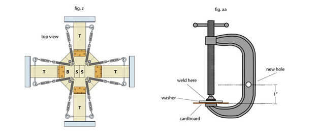 Paso 15: Cada uno de sus combos de torniquete/primavera fije a la parte superior girando el mecanismo. Los ganchos se conecte a los tornillos de ojo grande lag en los extremos de los brazos, y los extremos sueltos de los resortes se conecte a los tornillos de ojo lag sobresale la parte octogonal B (dos muelles por tirafondo). usted necesitará utilizar las abrazaderas de tornillo para sujetar los resortes como antes. Bien ajustar la tensión de los tensores más tarde. Usted puede bajar cada brazo forma que toque la mesa para mantener fuera del camino mientras trabajas. Ahora tome cada uno de sus abrazaderas de tipo C y perfore un agujero el principal brazo 1 hasta de la el punto mostrado en la figura. Gah Este agujero debe ser un poco más pequeña que una de sus cabezas de los tornillos. Después de que lo hayas hecho a los ocho, soldar sus arandelas 1 o 1 1/4 de diámetro para la parte móvil de la pinza como se muestra. Pegamento de soldadura funciona muy bien. Poner la cartulina entre la lavadora y la parte adyacente de la abrazadera para evitar que la vinculación. El propósito de estas arandelas es crear una mayor superficie en la abrazadera para evitar abollar sus marcos.
