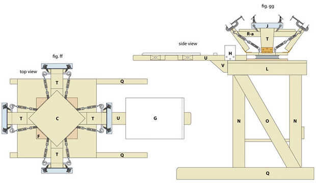 Paso 18: Después fije la repisa C en la parte superior para que las esquinas están en medio de partes R (véase Fig. FF). Ahora la arena de las esquinas que sobresalen de la parte Q y U. No sólo esto ahorrará algo de dolor potencial como imprimir, pero el extremo liso del brazo platina ayudará diapositiva camisas más fácilmente.