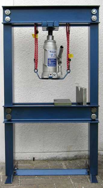 Bastante fácil resulta, todo lo que necesitas es algunos tornillos grandes, acero resistente y un gato hidráulico, después de algún trabajo en la forma de la soldadura, perforación, corte y pulido, 10 ton prensa aparece.