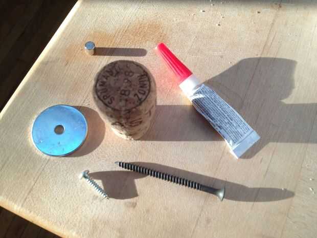Junté un yeso largo tornillo, un corcho, un pequeño imán, pegamento y un tornillo de madera del llano y la arandela.