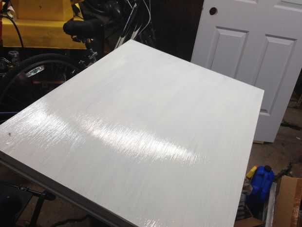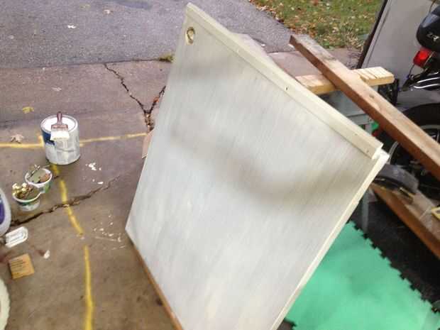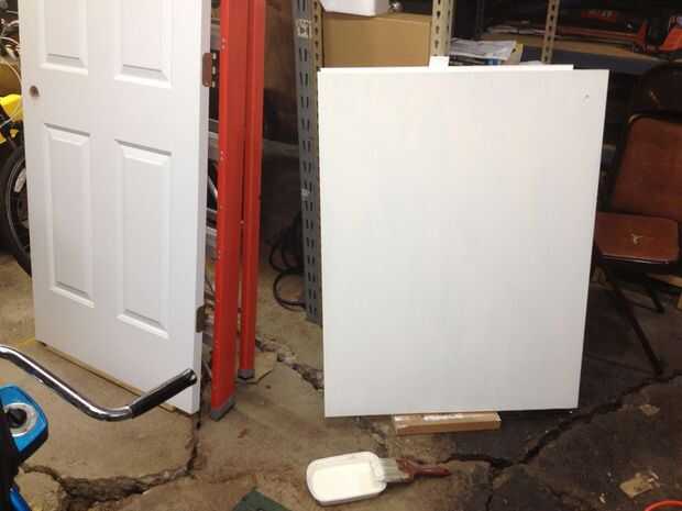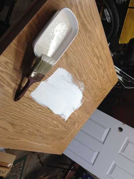 El paso que me olvidé hasta que fue demasiado tarde fue usar una imprimación primero. Pintura una pintura de color claro sobre una mancha oscura no va tan bien. Si lo hice otra vez, haría utilizar una cartilla diseñada para madera y luz de colores. Utilice tantas capas de pintura que necesita para hacer que la puerta se ven bien.