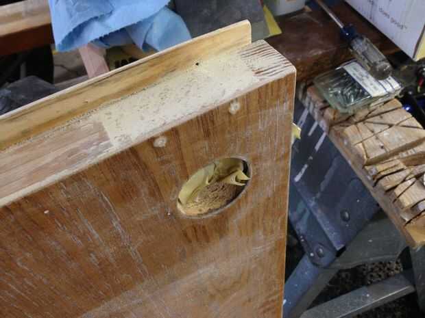 Pulir los bordes ásperos. Desde esta puerta ya estaba barnizada, la puerta entera necesita lijado para asegurarse de que la pintura quedaría un poco de luz.