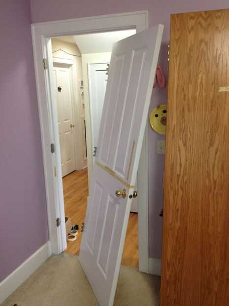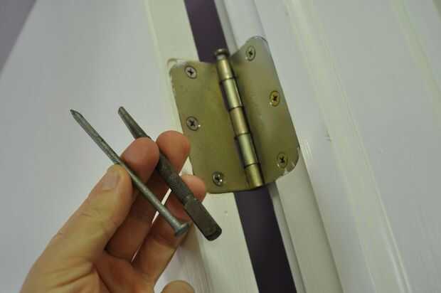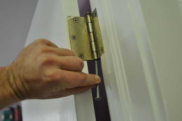 Utilice un martillo y un punzón, clavo pesado o una herramienta similar para subir los pines por la parte inferior de la bisagra y eliminarlos. Una vez que los tres se quitan, puede quitar la puerta del marco. Puede que desee que un asistente le ayude a. Tenga cuidado con la puerta y sus paredes y carpintería.