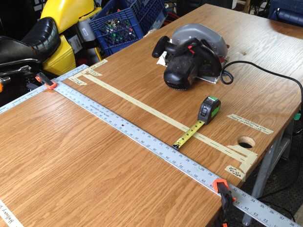 Sujeta una plaza de estructura (que dobla como un borde recto) a través de la puerta. Esto asegura que la línea es recta y cuadrada. Sujeta el cuadrado de cuatro pulgadas de mi línea de corte, ya es el ancho de la base de mi sierra circular a la hoja. Sujetando la sierra contra la Plaza, haría un bonito corte recto exactamente donde lo quiero.