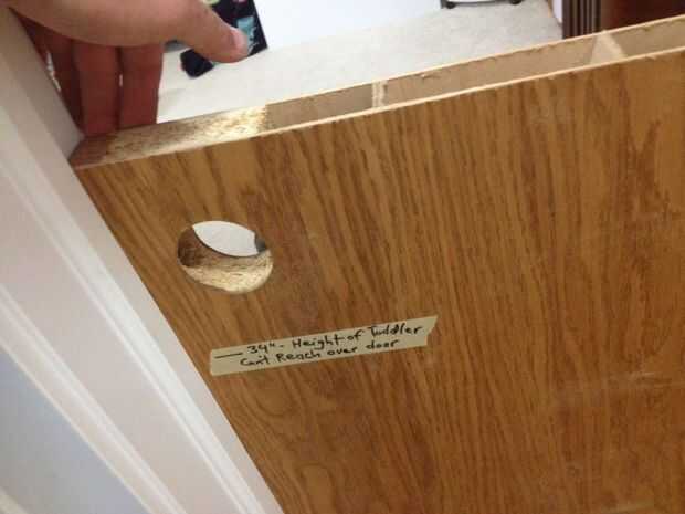 Antes de hacer el corte, recuerde que las puertas de núcleo hueco son en su mayoría aire! Hay madera en los bordes, el interior es sólo cartón y dos capas de chapa de 1/8 de pulgada. La chapa puede astillarse fácilmente. Para evitarlo, asegúrese de que la línea de corte es cubierto con cinta adhesiva o la puntuación de la chapa con una cuchilla de afeitar. Método que se utiliza, se debe hacer en la parte posterior de la corte. Una sierra circular corta en la dirección ascendente, es la superficie que necesita ser grabado o marcado.