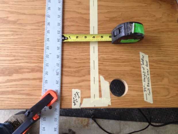 He apoyado la puerta en tableros de 2 x dos 4 a través de un par de caballos de la sierra. Con la ubicación aproximada de mi línea de corte en el lugar, lo confirmó usando una cinta métrica para confirmar que ambos extremos de la línea de corte eran la misma distancia de la parte inferior de la puerta.