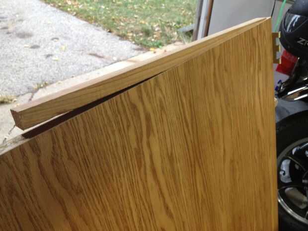 Corrí un poco de pegamento de madera por los dos lados de la pieza de relleno, que lo inserta en la puerta para que la parte superior de la misma fue al ras y entonces clavó en su lugar con unos clavitos de madera. Sujeta toda la anchura de la puerta, hasta que el pegamento seca.