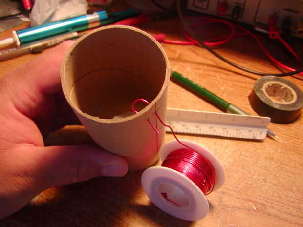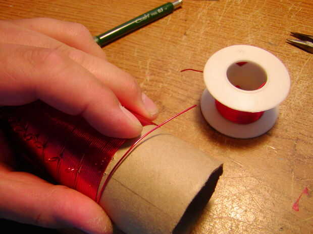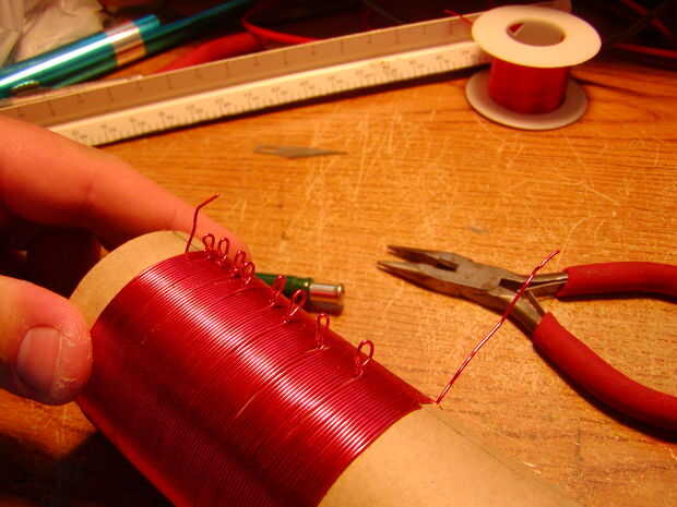 7) cuidadosamente envolviendo el alambre alrededor del tubo del agujero de inicio start. La parte más difícil es mantener las bobinas apretados e incluso.