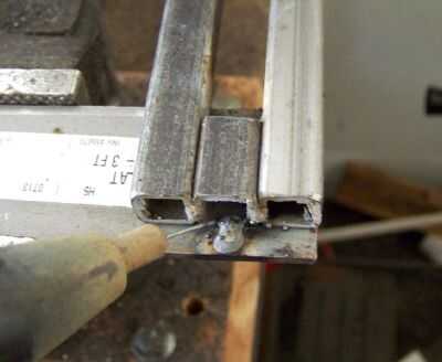 Puede alinear la hoja al mango por lo que hacen un ángulo recto perfecto por cualquier método que elija.  Use una escuadra que sabes que es verdad.  Método de uso 3-4-5.  Una vez alineados, sujeta los dos juntos para mantenerlos en la alineación como ves en la foto con el paso anterior.  Luego hice luz soldaduras en ambos extremos de 3/4" pulgadas pieza que es la mitad entre las dos partes más largo de la manija.  Esto significa que las fuerzas presentes de metal caliente contratación están actuando a través de la anchura de la lámina de la Plaza, no en un lugar donde pueden causar la hoja se tuerza en una esquina de 90 grados.  Aún así, todavía puede ser la necesidad de algún ajuste más adelante.  (En esta foto se puede ver que la luz de las soldaduras en los bordes de los extremos de la tubería cuadrada, demasiado.)