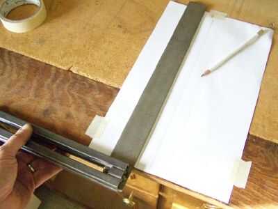 En este punto su proyecto parece un cuadrado, pero no puede asumir que la manija y la lámina son precisamente 90 grados uno del otro.  ¡ Estoy revisando por trazando una línea en un trozo de papel con cinta hacia abajo para que no se mueva.  El mango de la Plaza está descansando contra el borde de un pedazo de madera contrachapada que se utilizo como una regla confiable del corte de máquina.