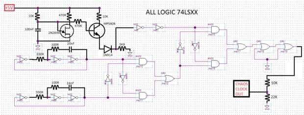 Puesto que la red neuronal sintético en el FPGA es asincrónica, es posible utilizar una fuente de señal para stim_line interior de la FPGA, que no se asemeja a una señal de reloj tradicional. Esta señal de "reloj de caos" se deriva de dos osciladores de inversor 74XX básica y un oscilador de relajación UJT. Las salidas de estas tres fuentes de señal de reloj normal y sano son entonces XORed juntos en las puertas XOR de no, y, y o puertas (por implementación de la solución de la suma de los productos al mapa de Karnaugh de la función XOR XOR). Debido a retrasos en el cableado físico y el hecho de que tres osciladores sincronizados y propensa a frecuencia de deriva son la fuente de señal, la señal de salida del reloj del caos termina pareciéndose a una gama de la montaña, una cordillera nonperiodic en aquel. Extracción de la aleatoriedad de la tela de la realidad misma puede permitir la manifestación de voluntad libre en el dispositivo resultante.