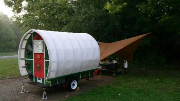 También está equipado con una cama de tamaño completo, tire hacia afuera de la tabla, luces y un fregadero en la esquina de una lámpara de cristal al revés.