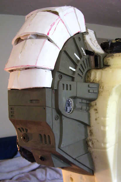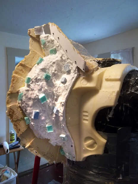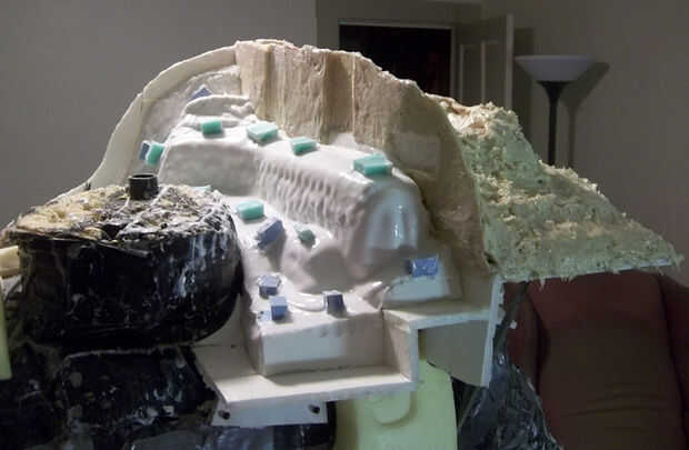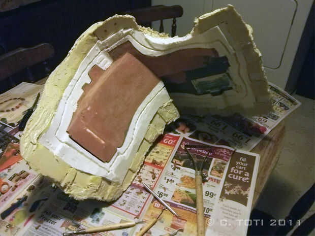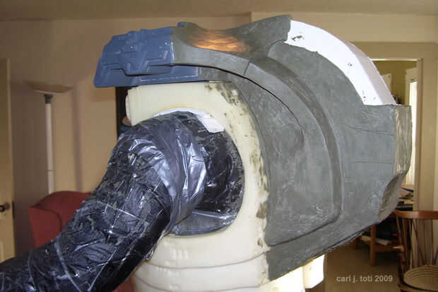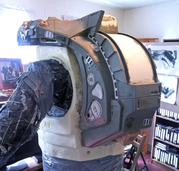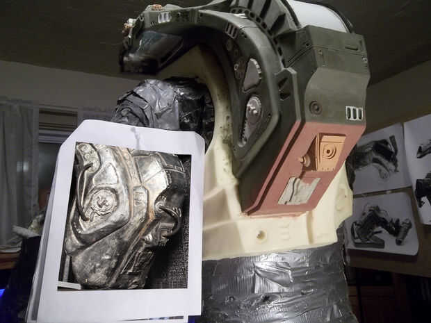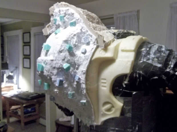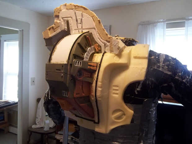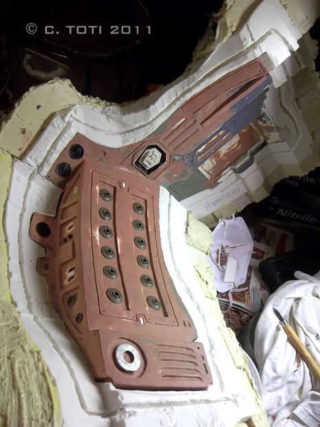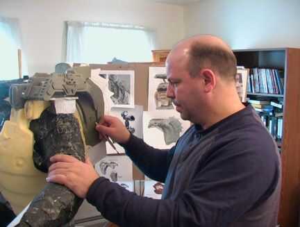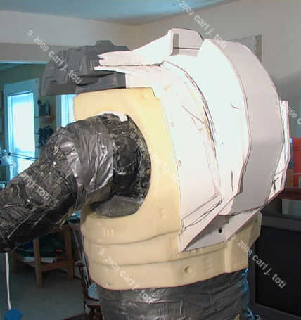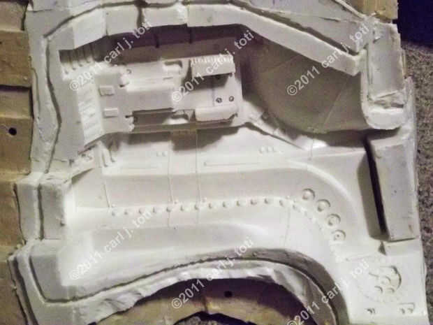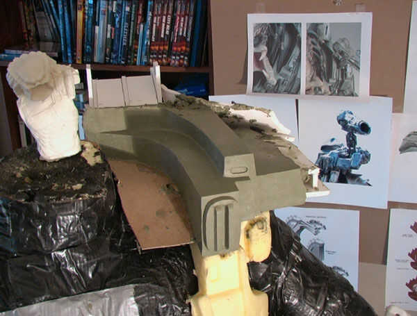 "La escultura comenzó con un tirón de espuma densa de la armadura de torso que tuvo que ser esculpido y fundido primero (naturalmente). Luego construí una base de la espuma y pegamento caliente núcleo esqueleto que arcilla se pega muy bien a. He usado arcilla media sobre Chavant NSP que viene en bloques de 10 libras que derriten en mi olla. La propiedad física de la arcilla es tal que es fácil de trabajar cuando se caliente y plumas agradable. Mientras se enfría, se convierte en más difícil, que la hace ideal para las piezas de la máquina-como porque realmente puede tallar las líneas y surcos en ella, etc..