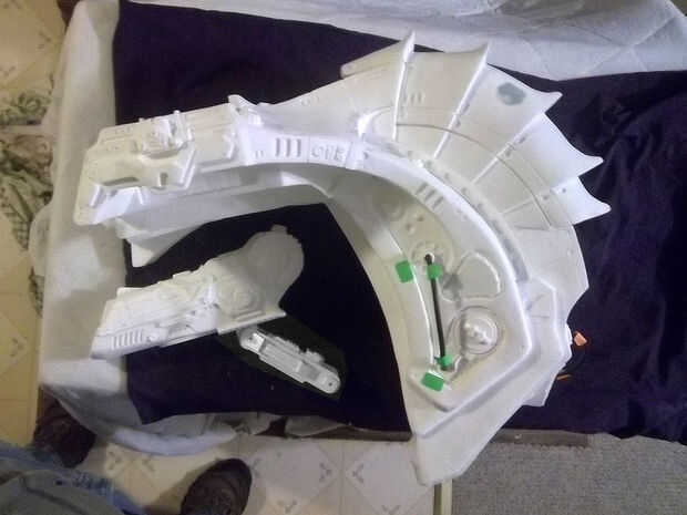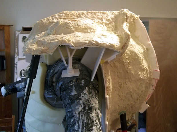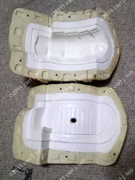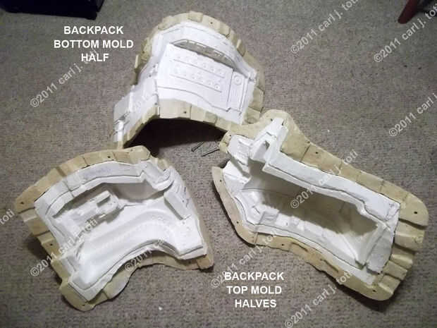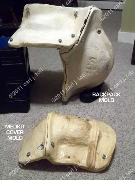 El roto-caster era necesario porque no no hay manera de aguanieve echó-el molde es simplemente demasiado grande y demasiado pesado para tratar de sostener en tus manos - el molde listo para lanzar pesa más de 50 libras. La rueda roto gira el molde en una Asamblea de fotograma a fotograma cuando se vierta la resina en hacer girar el molde y obtener un espesor de pared de resina incluso agradable en su casting final. La mochila y la cubierta para el área de juego med se realizaron utilizando diferentes moldes. La mochila es totalmente hueca para reducir peso y dejar espacio para la electrónica así como un kit de med precisa pantalla futura.