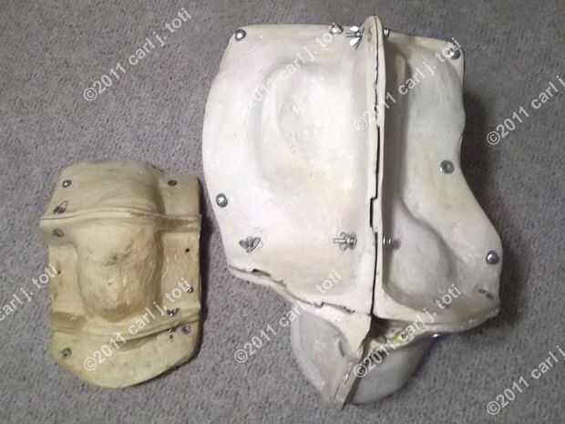 Chavant NSP es un azufre libre arcilla-si el barro tiene azufre y entra en contacto con un material de molde de silicona que el molde de silicona no la cura. Así una vez terminada la escultura que tienes para moldearla. Para artículos grandes como esta mochila un molde madre es el camino a seguir como un molde de caja grande sería impráctico - un molde de tipo caja utilizaría una enorme cantidad de compuestos de moldeo de silicona y sería muy pesado. El molde de una madre es un tipo de molde que tiene una capa de silicona rodeada por un forro rígido (a menudo llamado una chaqueta) - a veces el refuerzo es fibra de vidrio o yeso, pero en este caso Plasti-Paste fue utilizado como un molde de yeso grande movido hacia atrás puede ser muy pesado.