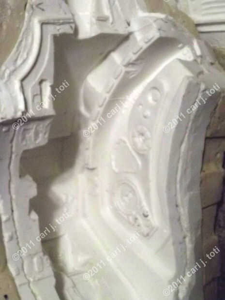 Una vez que se ha curado la silicona un material del forro rígido se aplica a él. Después de que el respaldo ha curado secciones adicionales de la escultura se moldean usando el mismo proceso. Cuando las secciones adicionales de moldeo por un agente del fusor de molde (en este caso vaselina) debe aplicarse al molde líneas de despedida que la silicona se pegue a sí mismo. Una vez que todas las secciones han sido moldeadas agujeros son perforados por el rígido respaldo así los pernos pueden ser utilizados para unir todas las secciones de molde. A continuación un orificio está cortado en el molde por lo que se puede verter la resina: el bastidor de la mochila utiliza aproximadamente 96 onzas de resina. Después de ello, el molde puede ser tomado aparte y la escultura se retira del molde y el molde está listo para la fundición de la rueda roto.
