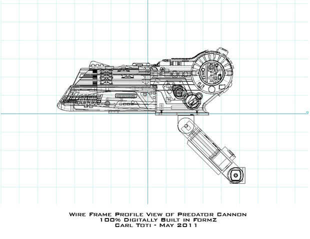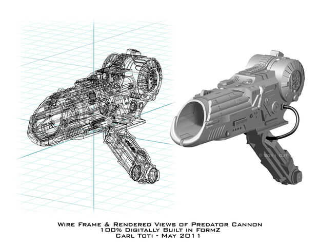 En el 25 aniversario de depredador, Carl pulsó encima de una conversación con Richard Landon. Richard fue uno de los miembros de la tripulación de Stan Winston Studios que trabajó en la película original. Carl había presentado a miembros de la tripulación original de la película con un trofeo de su entonces nuevo cañón. Richard quedó realmente impresionado por el detalle y Carl le preguntó sobre el cañón de película deforme. Richard se rió y le contó una historia sobre cómo fue el rodaje de la película en la selva y estaba muy húmedo en el momento. Resulta que, el cañón de la película fue cabido con los squibs que se envió en secuencia para simular el fuego del cañón durante el rodaje. Porque era tan húmedo, squibs múltiples sucedieron incendio en once - kablamm! Todo el lado del cañón había soplado aparte!