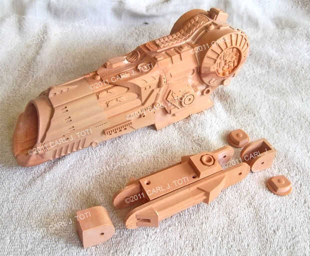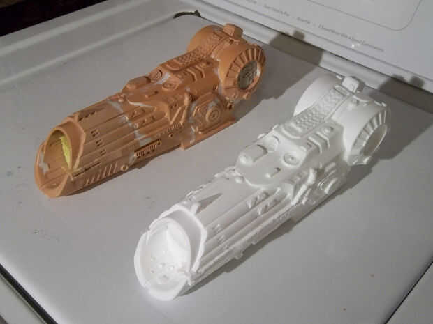 Carl había montado el modelo de impreso de cañón, alisa las costuras y había moldeado para fundición de resina utilizando silicona base lata lisa en molde Max en un molde de la caja. Un molde de la caja es una un pieza molde donde se coloca el elemento a ser moldeado en una caja y moldeado de silicona compuesto se vierte alrededor de él. Si un elemento es realmente pequeño el molde de la caja puede ser vertido en una sola toma y el modelo se puede cortar. En este caso el cañón es un demasiado grande para esto por lo que el molde se hace en dos mitades. Una cama de arcilla está construida alrededor de una mitad del cañón y tuberías se ejecutó alrededor de él para formar un bloqueo del molde y luego moldeado de silicona compuesto entonces fue vertida sobre el cañón. Después de que la silicona se seca la arcilla es removida y un desmoldeador se aplica al molde primera mitad. Ahora silicón se aplica en la segunda mitad del molde y permite curar. Una vez que la silicona ha curado el molde se puede dividir en dos y se quita el modelo. Ahora la resina se vierte en el molde y es aguanieve cast-el molde se mueve alrededor en múltiples direcciones por lo que la resina forma un capa dentro del molde.