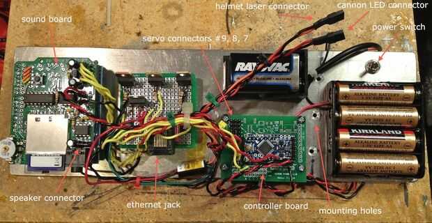 Ahora que tuve la mecánica hace que necesitaba para hacerla mover. Usé un Arduino Mini Pro para manejar las entradas y movimientos servo y y un Arduino Pro con un protector de la onda de Adafruit para manejar los efectos de sonido. Hay una pequeña tabla que tiene tres transistores en él-los transistores encienda la mira láser de casco y disparar el cañón LED y efectos de sonido. La Junta también tiene un 3.3V regulador para proporcionar energía para la vista del laser del casco.