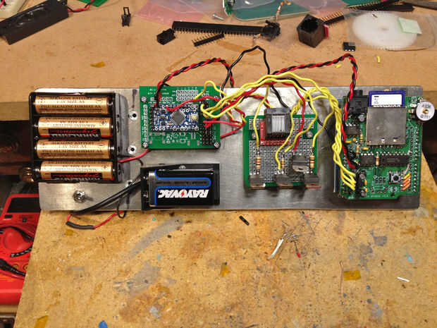 La electrónica se monta en una 1/8" espesor placa de aluminio con separadores de plástico y tornillos 4-40.