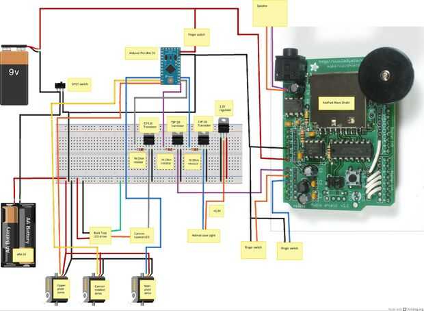 Se muestra el diagrama de cableado completo y he incluido el sonido sonido de archivos uno es para el cañón, una es el depredador "chasquidos" y el último sonido es el rugir del depredador.