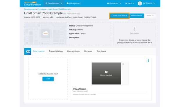 Después de agregar el canal de datos, ahora crear un dispositivo de prueba. Esta prueba es igual que la placa de desarrollo. Cuando se conecta la placa de desarrollo a MCS, usted puede recibido datos procedentes de la Junta de desarrollo y también dar comando al dispositivo así.