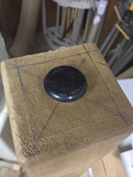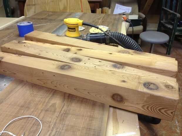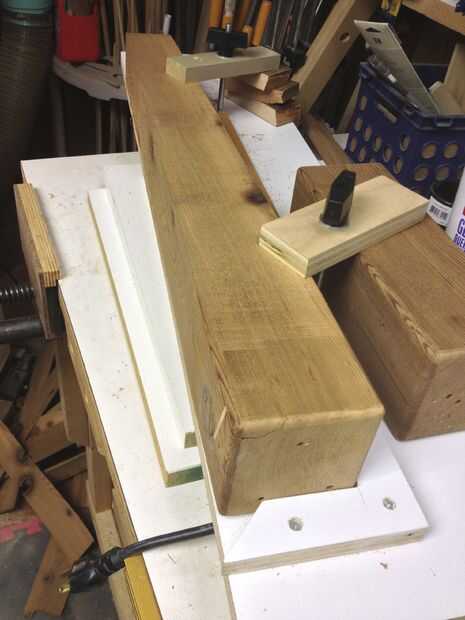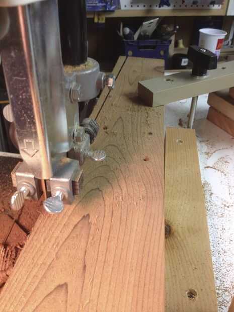 Mi sierra de mesa no corte una pierna este espesor sin hacer 2 pasos para que los cónicos en mi sierra. La cinta deja un acabado más áspero y que se veía aún mejor en esta mesa rústica. Hice una plantilla rápida y sucia para cortar las piernas que se pueden ver en la foto 3. La plantilla tiene un corredor que se desliza en la pista del inglete de la mesa de Sierra de cinta. Sostenga dos bajadas eran suficientes para asegurar la pata a la plantilla. Había anclado un bloque en forma de L y un bloque largo para la colocación de la pierna en la plantilla. Una vez que has cortado a 2 lados, el bloque largo ya no es preciso y se hace necesario alinear su marca en la parte inferior de la pierna con el borde de la plantilla antes de sujeción.