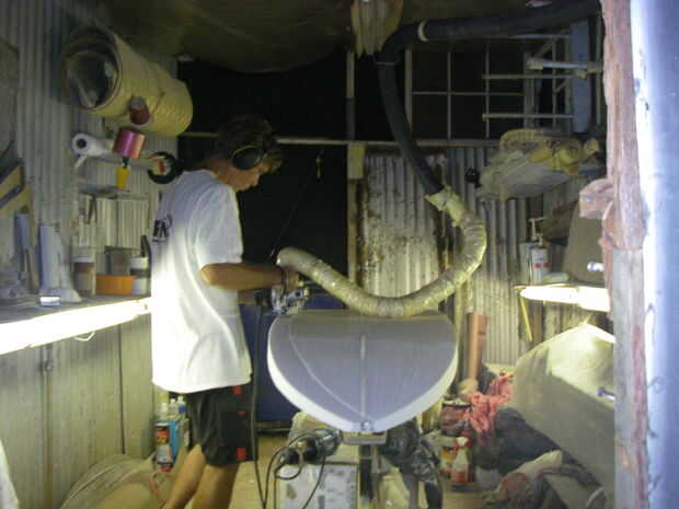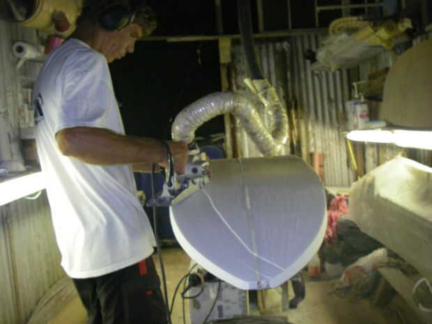 aprender a una tabla de surf con forma de arena suave desde el famoso Johnny "V" Voxlund en Maui de Haiku.Continúa la saga iniciada a construir una tabla de surf.Los principales que forma con el cepillo es sobre. Ahora comienza el trabajo fino,