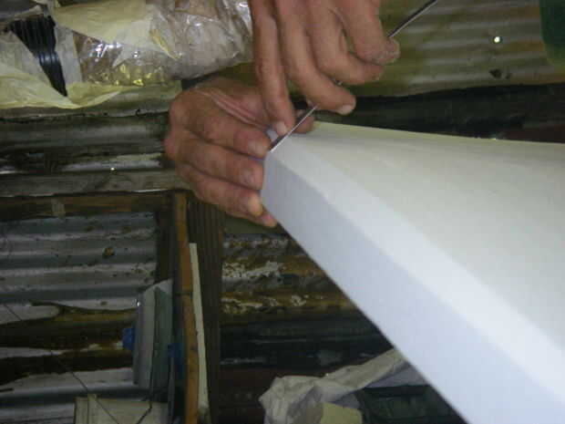 Hay dos biseles, uno superior, que se desvanece en la "corona", o la parte plana sobre la cubierta, y el bisel inferior, que debe ser un bisel de 45 grados. Los cartabones se cortan antes de toma la nariz hacia abajo, por lo que funcionan la longitud entera de la Junta. La parte plana, restante desde el borde de la pieza bruta se llama la banda de la plantilla y continúa existiendo como una referencia para el resto de la configuración de borde.