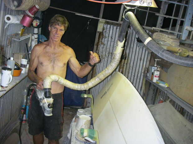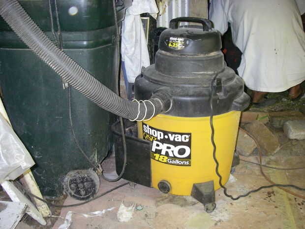 Jonny utiliza un muy flexible de tubo secador de ropa para eso. Se lamenta que ya no se hace este tipo de manguera. La manguera está suspendido del techo justo sobre la Junta. Enchufa la manguera normal que viene con el shopvac. La manguera shopvac no es lo suficientemente fuerte y puede colapsar en el mismo lugar. Envuelve con alambre allí para mantenerla abierta. El shopvac es un modelo muy tranquilo.