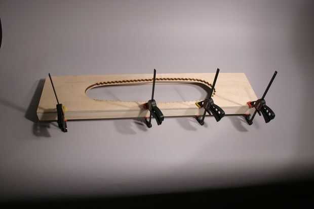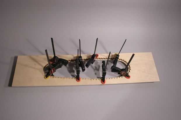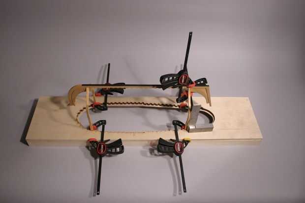Intercalando las dos capas de madera contrachapada juntos, tiene la plantilla completa. Puedes ver cómo usé pinzas para unir las dos capas así como de las piezas base de la plantilla. Los bordes exteriores de la pieza de estante deberán cortarse para caber dentro de las tablas de pino o chopo que forman la base de la plantilla.